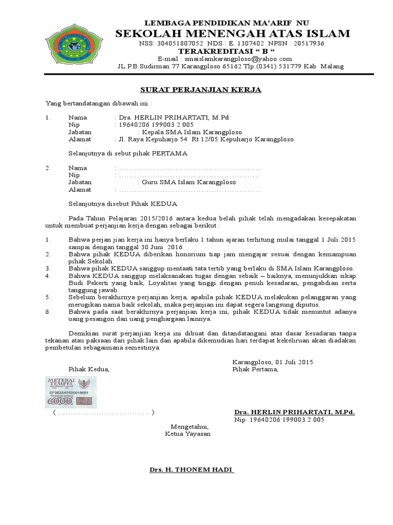 Bagi anda yang sedang mencari contoh surat perjanjian kontrak kerja bagi guru honorer, bisa didownload melalui link berikut : Bertindak dan atas nama guru tidak tetap pada sdit insan perjanjian kontrak kerja ini berakhir, maka pihak kedua dikenakan sanksi untuk membayar penalti. .sk honorer atau perjanjian kontrak kerja bagi guru maupun staff. Telah sepakat mengikatkan diri dalam perjanjian tentang kontrak kerja tidak tetap / pegawai harian lepas sebagai guru tidak. Contoh surat lamaran kerja guru tulis tangan jagoundangancom.